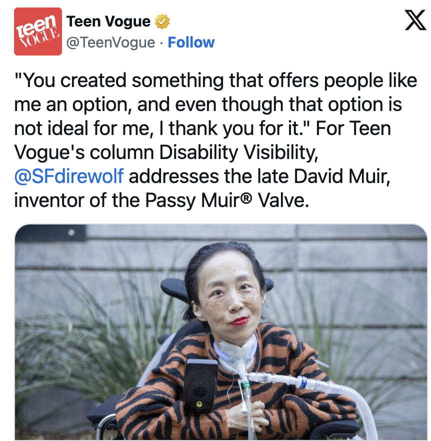 For #DisabilityPrideMonth, I produced an audio story for my latest Teen Vogue column on the late David Muir, a disabled inventor of Passy Muir® Valve and my attempts to speak again. Text transcript included.
