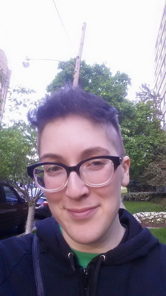 [Image description: A white, butch person with brown hair and glasses smiles for the camera. There are trees and parked cars behind her.]